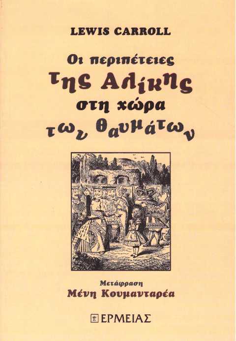 Τίτλος πρωτοτύπου: Alice’s Adventures in Wonderland Συγγραφέας: Lewis Carrol Mετάφραση: Μένης Κουμανταρέας Πρόλογος: Λ. Αννίνος Εικονογράφηση: John Teniel, Lewis Carrol Εκδόσεις: Ερμείας Σελίδες:160 (17*24) Μαλακό Εξώφυλλο